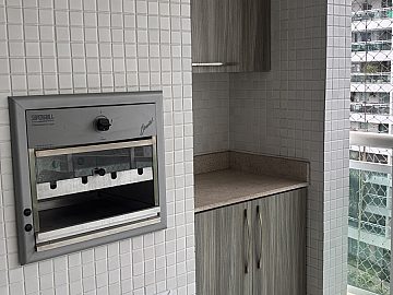 Varanda com rede de proteção , Churrasqueira e mesa e sofá.